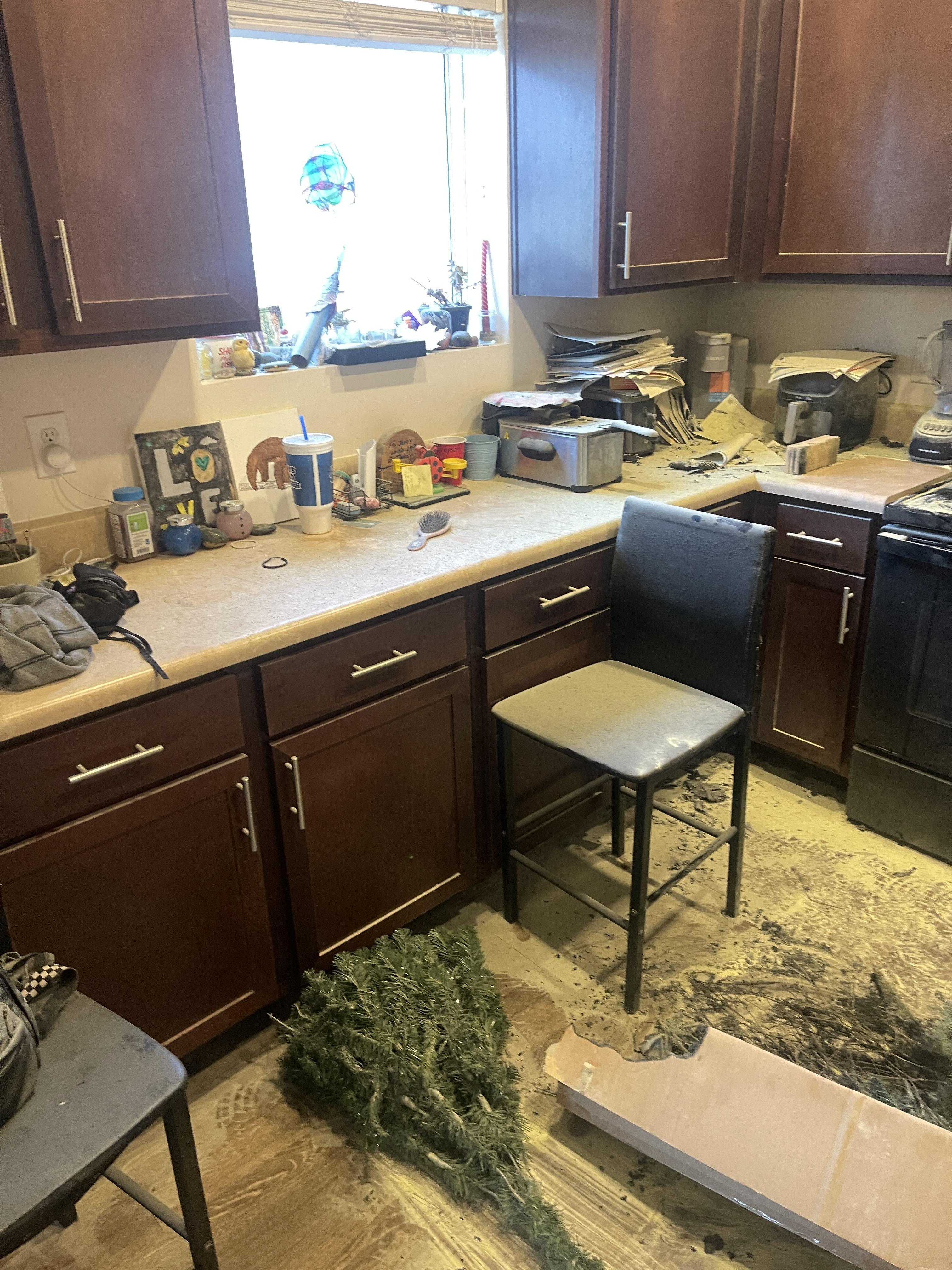Heavily damaged kitchen with smoke, soot, and debris on counters and floor, before professional smoke damage cleanup by Teasdale Sarasota.