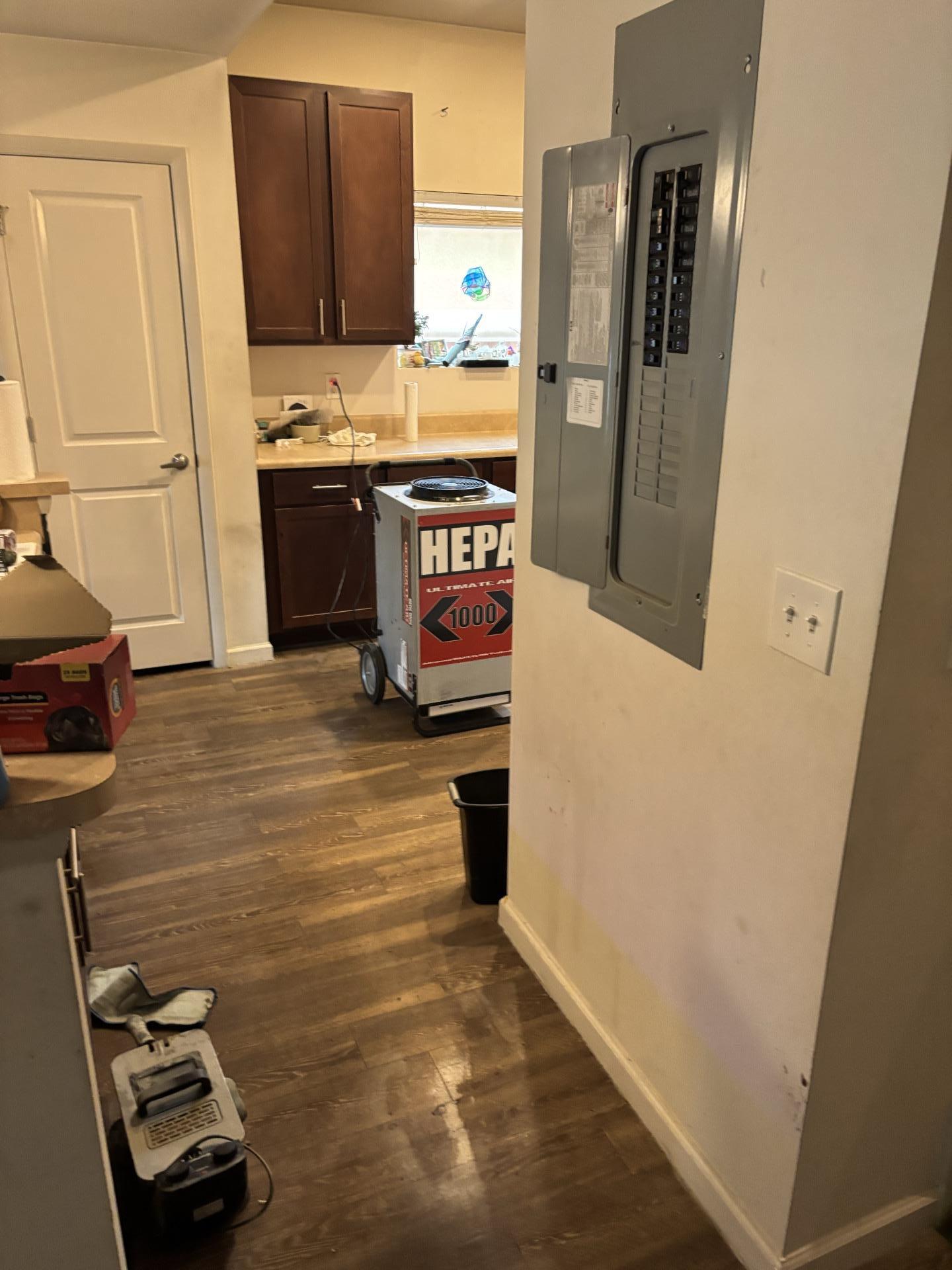 Kitchen undergoing smoke damage restoration with a HEPA air scrubber for air purification, showcasing Teasdale Sarasota's cleanup process and equipment.