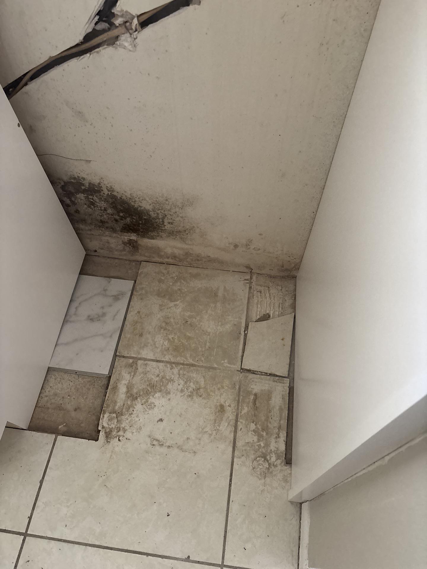 Extensive black mold growth on a wall and damaged floor tiles, indicating severe water and mold damage before Teasdale Sarasota intervention.