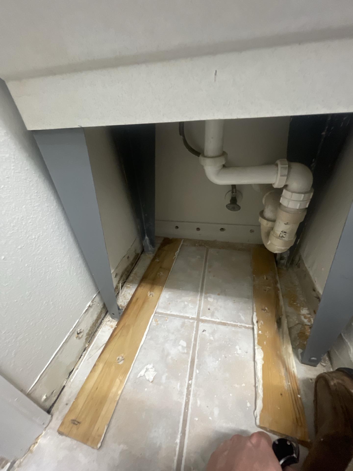 Our team provided comprehensive water damage restoration services. This included careful demolition and removal of the water-damaged sections of the wall and baseboards, as seen in the initial remediation phase. We then prepared the affected area for repair, including installing new structural wood pieces for the subfloor or wall base, ensuring proper drying and sanitation before reconstruction. The plumbing underneath the sink was also inspected to ensure no ongoing leaks.