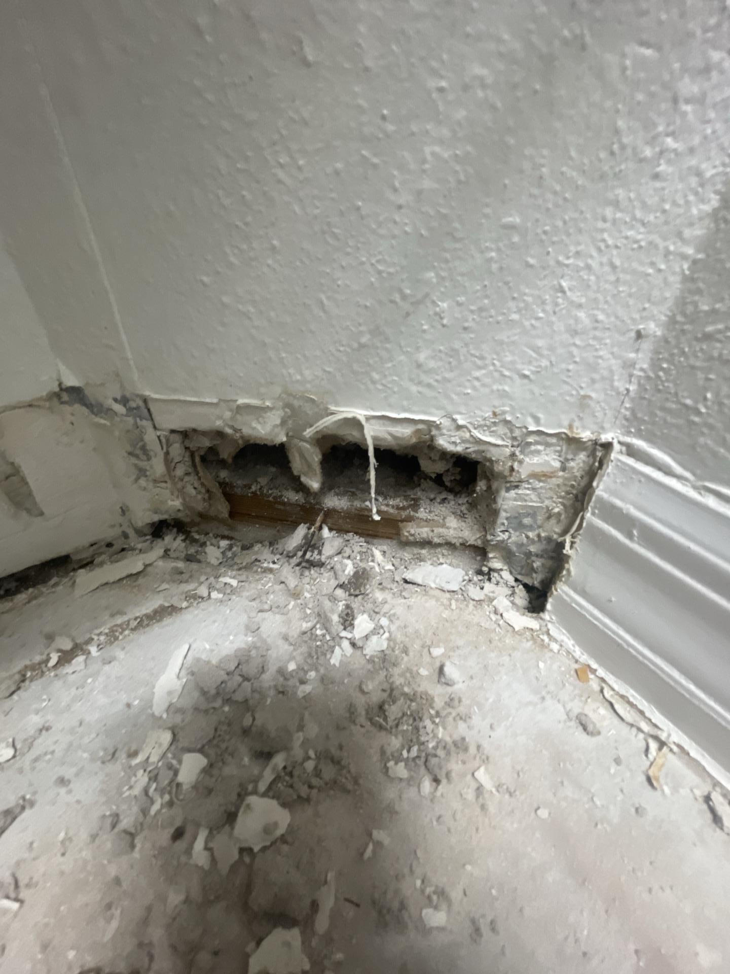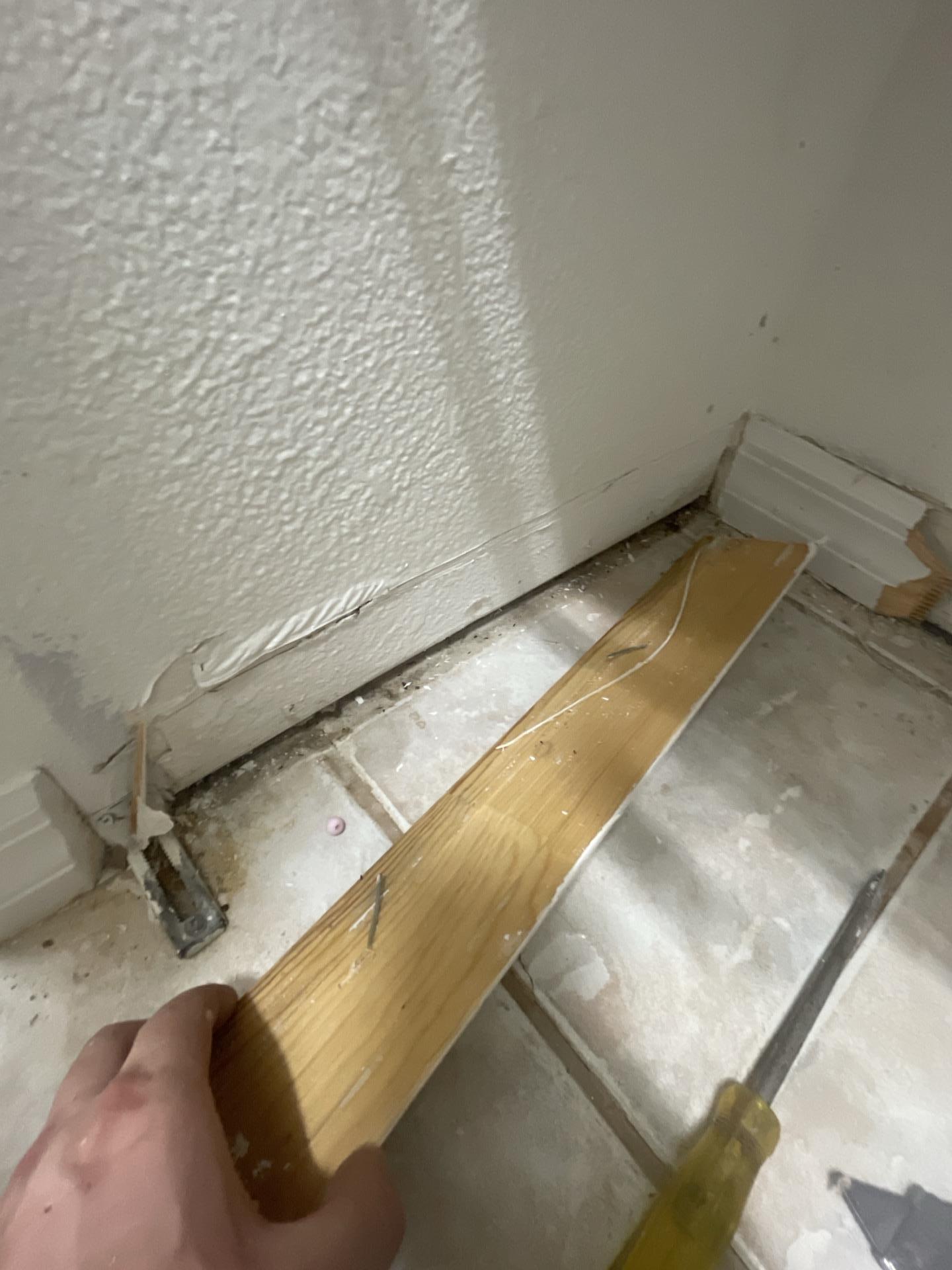 The customer experienced significant water damage, necessitating professional restoration services to address affected walls, baseboards, and potentially subflooring. The images indicate damage in a specific area, possibly under a sink or along a wall, requiring removal of compromised materials.