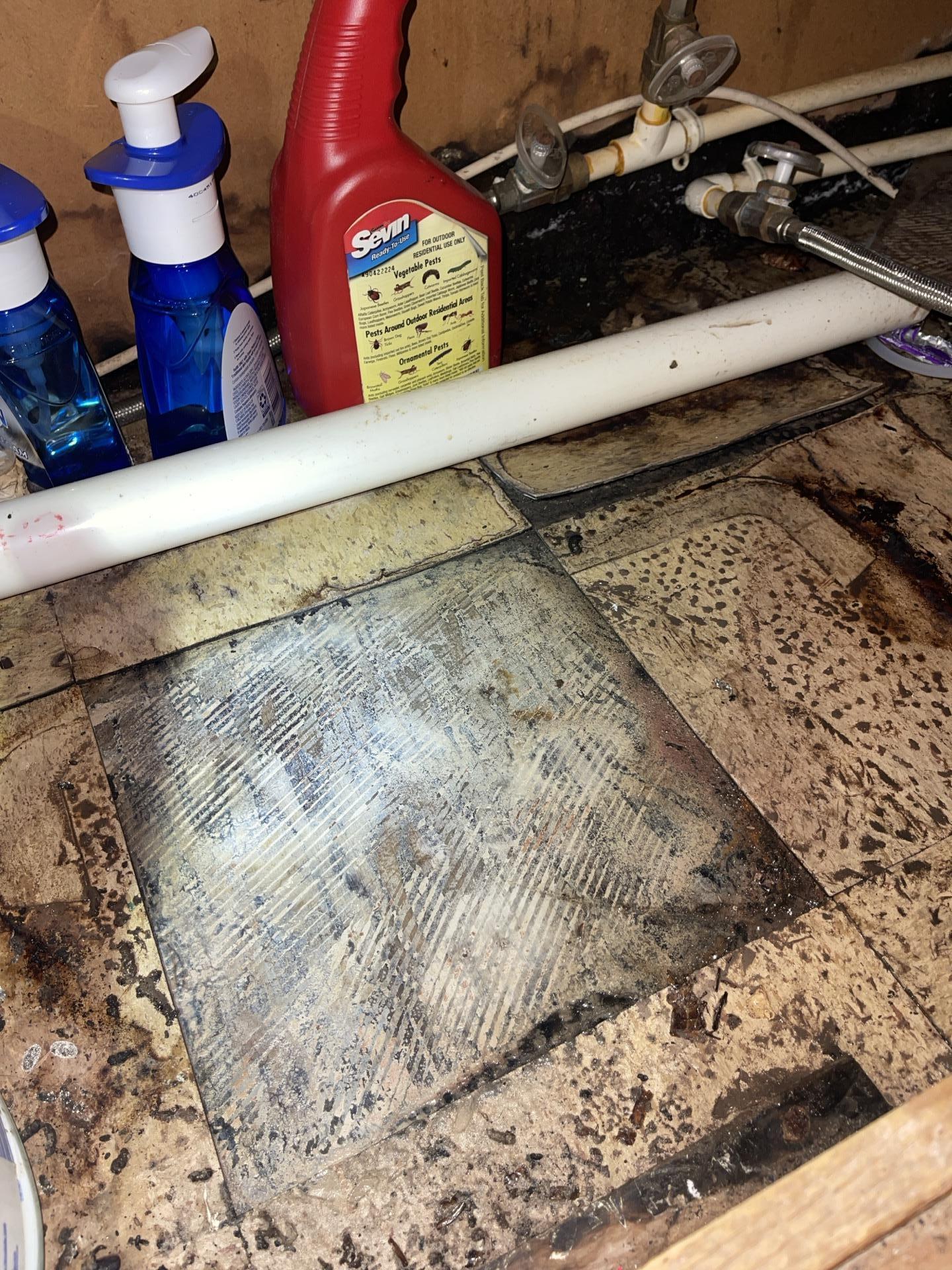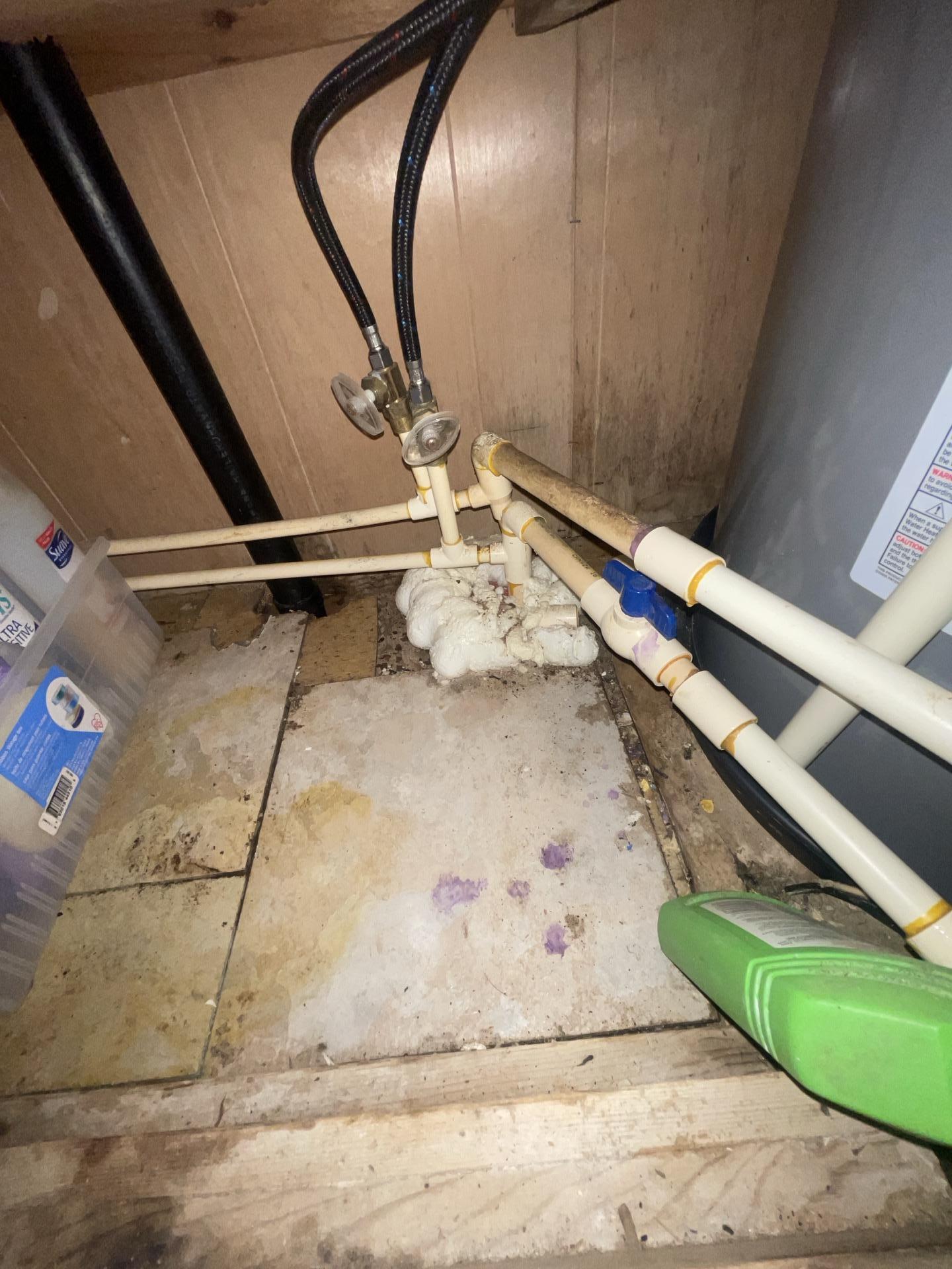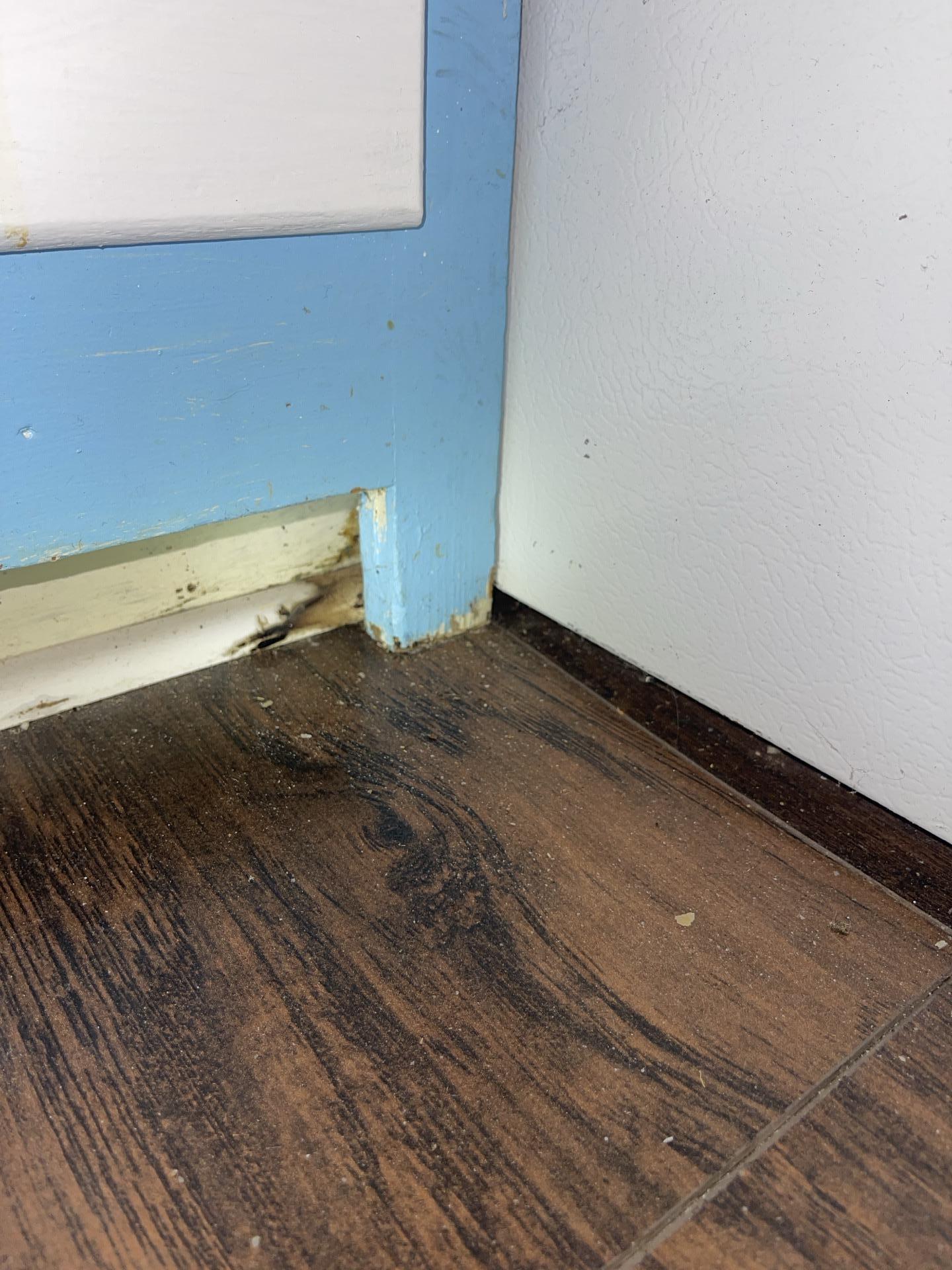 The customer experienced significant mold damage due to water intrusion, likely from plumbing leaks under a sink and around a toilet area, impacting the flooring and structural elements.