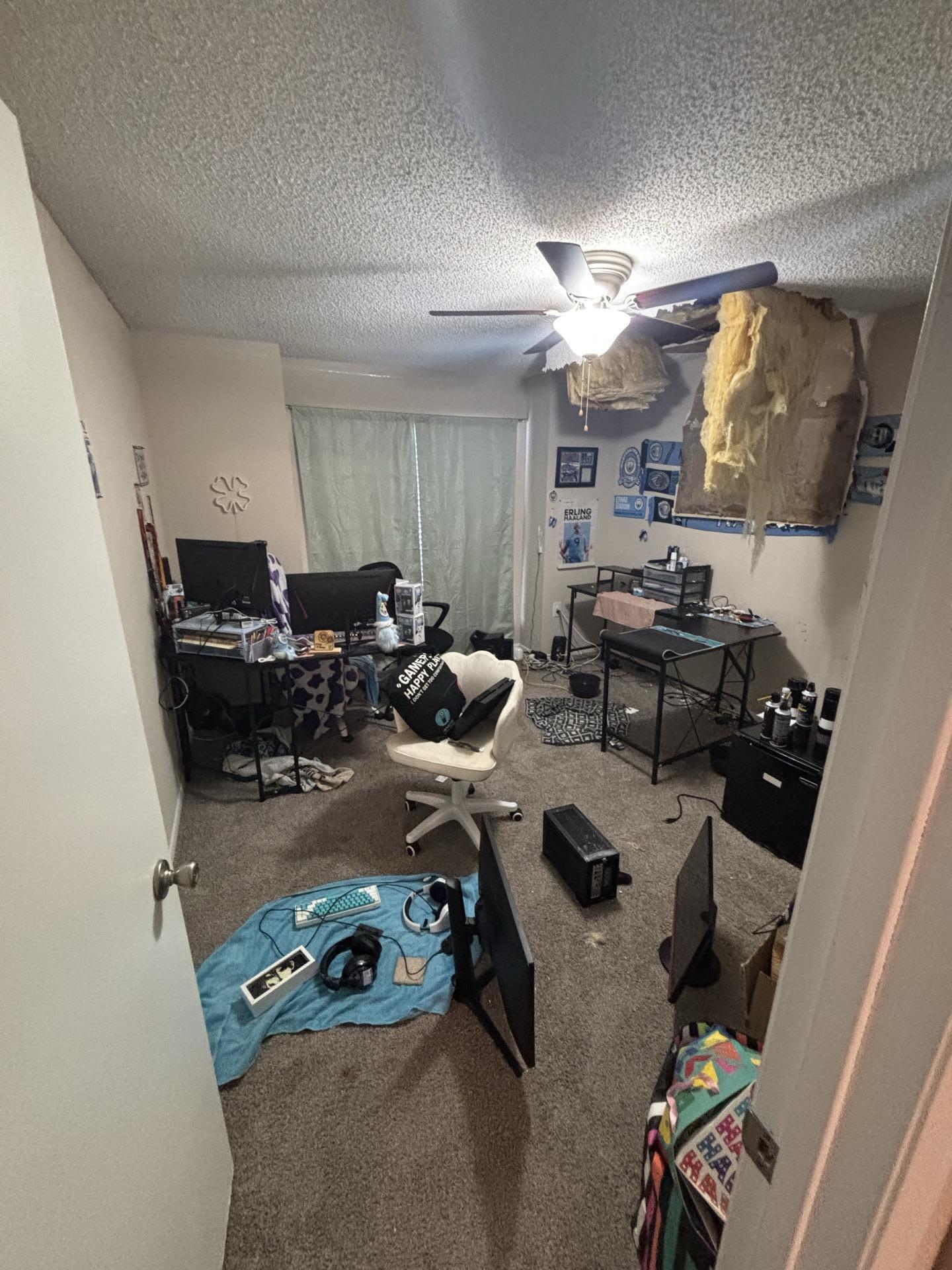 The customer required urgent assistance following a significant ceiling collapse in a bedroom. The failure of the ceiling materials exposed internal insulation and structural components, creating a hazardous environment and potentially damaging sensitive electronics and furniture within the room.